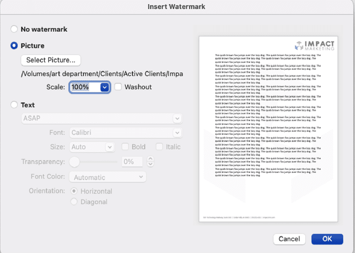 In the “Insert Watermark” window, click “Select Picture” and choose the jpeg of your letterhead. The scale will depend on the resolution of your jpeg. The most common resolutions are 72 ppi, 150 ppi and 300 ppi (ppi are pixels per inch). 72 ppi is the standard for screens and 300 ppi is the standard for printing. A quick guide is 72ppi=100%, 150ppi=48% and 300ppi=24%.