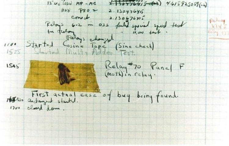A more concrete source of this origin comes from 1945 where a U.S Naval officer named Grace Hopper recovered a moth interrupting the relays of Harvard’s Mark II computer. The heat and lights of these room sized computers were known to attract all sorts of bugs. This event isn’t believed to have coined the phrase, but is often pointed to as the source of its growth of popularity. Mainly due to its now infamous physical documentation among developers.