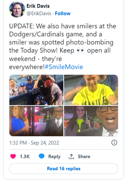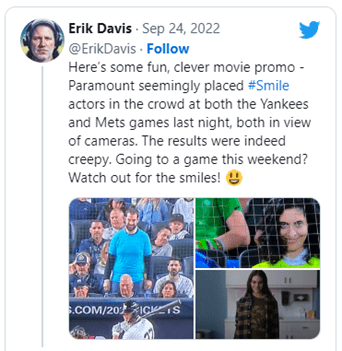 ‘Smile’ is a horror movie that was released late last year. Because there have been so many horror movies released lately, Paramount knew that they had to do something different to stand out. Instead of spending a large amount of time and money on TV advertising, Paramount took a different, more organic route. Paramount decided to place several actors at different NFL and MLB games in the months leading up to the theatre release. The actors would hide among the crowd and would – you guessed it – smile during the whole game. It wasn’t a normal smile, though. It was a sinister smile, referencing the movie poster and movie trailer. It didn’t end there. Actors would also be among the Today Show crowds, standing behind the news reporters, smiling eerily.